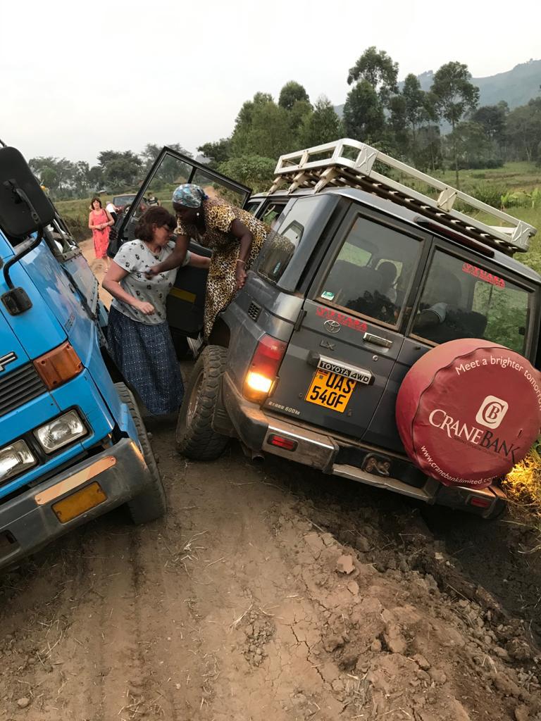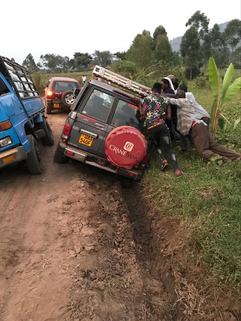 We drove higher up into the foothills of mount Elgon to visit other families and then on the way home one of our vehicles got stuck in a ditch but luckily a group of men from the nearby village came to our rescue and helped push it out!