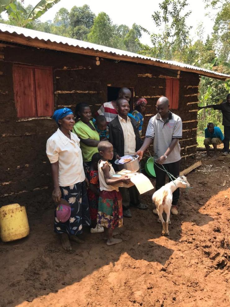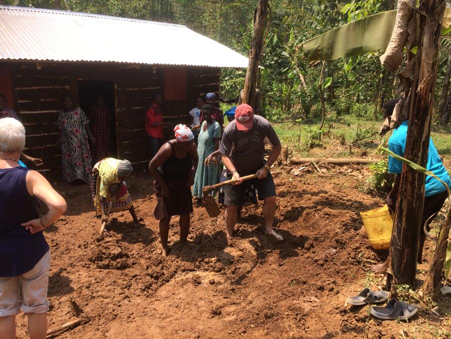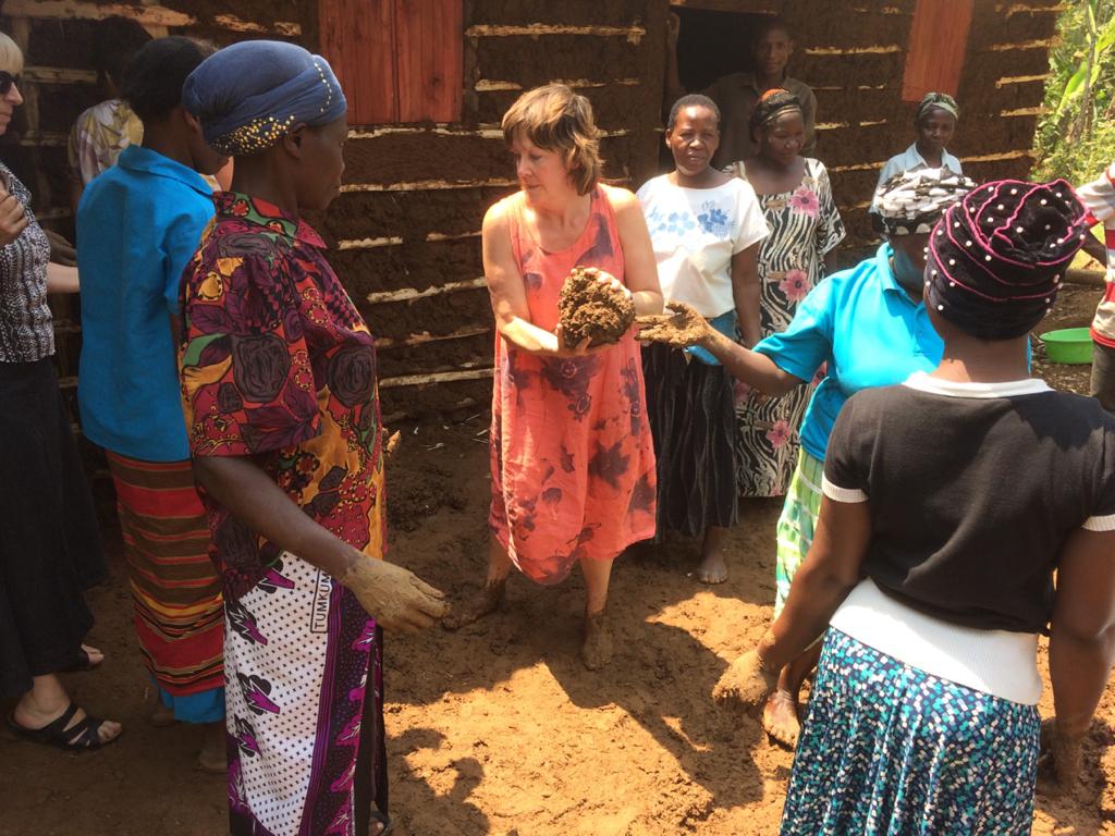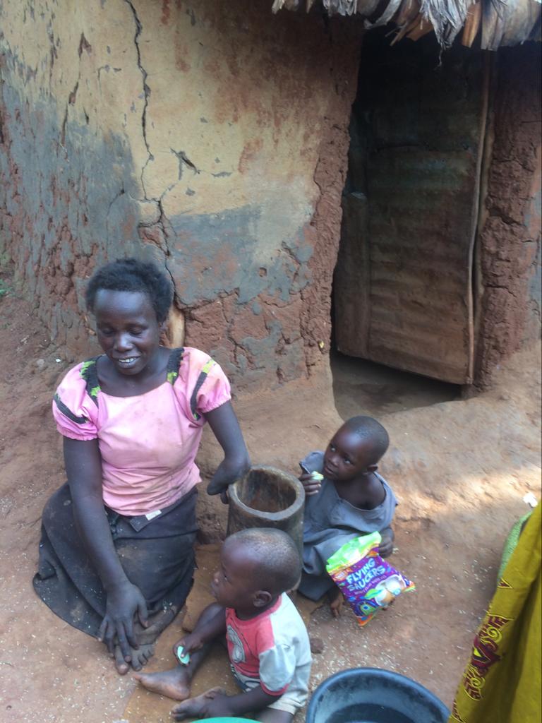 Thursday  –  We visited Nakatsi Landslide Women’s Association in Bududa to help with the ‘mudding’ of a new shelter (traditional home) which the group had built for Olive and Andrew.    Their home had been washed away in the landslides towards the end of 2019 and, tragically, 4 of their 7 children also died.    Our funding enabled UWCM to buy a piece of land for them and also paid for the iron sheets for the roof plus doors, windows, nails etc.